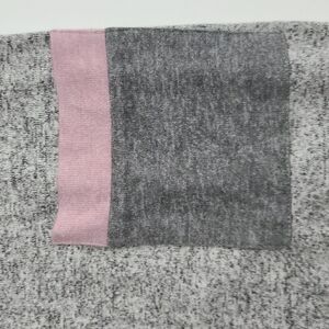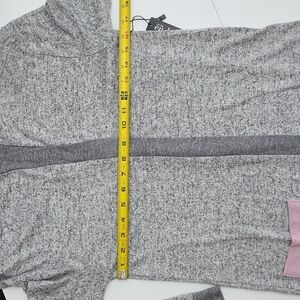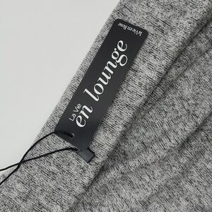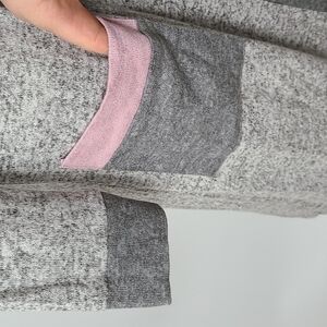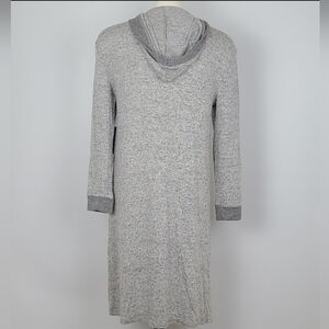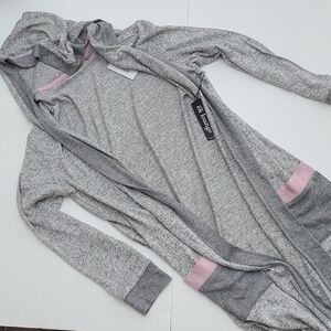 New with tags, La Vie "en Lounge" super soft, knee-length grey open front cardigan with darker grey and pink accents and hood, size XS / S.