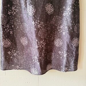 An easy, elegant satiny slip by La Vie en Rose in a deep purple/grey tone with a quiet floral shimmer throughout. The draped cowl neckline and adjustable straps give it that relaxed 90s shape and the tie in the back is so sweet. It's soft, a little slinky, and perfect for layering or wearing in it's own. This piece feels just as good dressed up for a dinner as it does barefoot on a quiet morning. In excellent pre-owned condition.