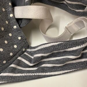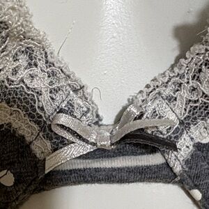 Chic gray bra with polka dots. Features delicate lace trim. Stylish and comfortable.