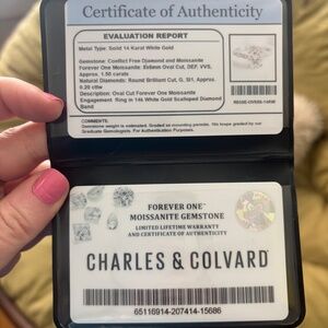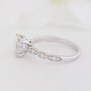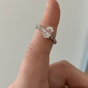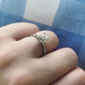14k White gold, size 7, 1.5 carat moissonite centre with diamond side stones