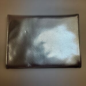 Lovely textured finish metallic silver pointed envelope clutch / cosmetics bag from La Prairie with silver lining, silver tone metal flap edge and magnetic closure. Excellent preloved condition no stains or tears. Like New. For Measurements please see the photos.