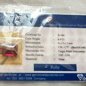 Elevate your jewelry collection with this stunning 6-carat Red Ruby, a loose gemstone that boasts an emerald cut and a mesmerizing transparent red hue. Measuring 11 x 9 x 5 mm, this natural ruby has been carefully sourced from the rich mines of Mozambique and cut to perfection to maximize its radiance and brilliance. Certified by GL and carrying a certificate number W-981, this gemstone is a testament to both beauty and quality. Its deep red color is complemented by a specific gravity of 3.97 - 3.99, ensuring this piece is not only eye-catching but also of the highest standard. Ideal for jewelry makers or collectors looking to add a touch of luxury to their ensemble.