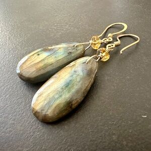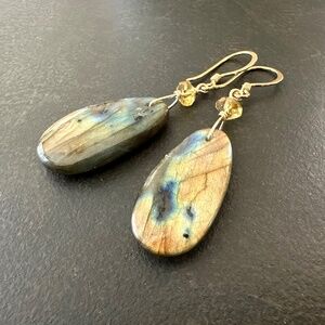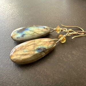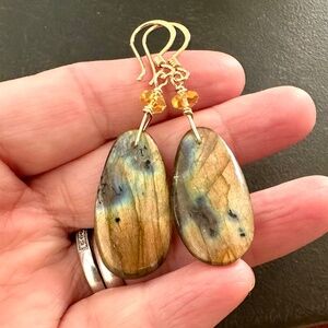These labradorite statement earrings are handmade by me using natural labradorite slices in sunset gold with flashes of ink blue. The stones are wire-wrapped using 14k gold filled wire and topped with citrine crystals. The ear wires are 24k gold vermeil.
