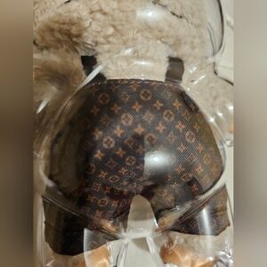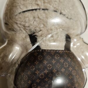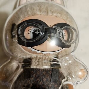 Adorable bunny figure wearing goggles. Features a fluffy hood and patterned outfit.
