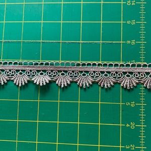 8 yards of 1.24” guipure lace 100% polyester. Color taupe