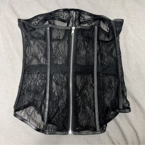 PC. See through lace bustier with faux leather trim and metal zipper closure along the back.