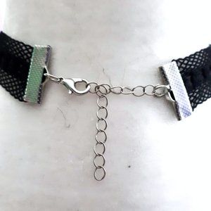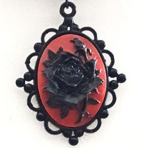 Handmade cameo on black stretch lace. Choker is 12" (30cm) long with an extension chain of 2.5"(5.5cm). Pendant is 1.5"(3.5cm) long and hangs from a jump ring through the lace. The cameo is black flowers against a red background set into an ornate metal frame.