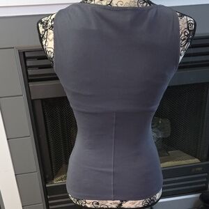 Elegant gray tank top with lace overlay. Perfect for layering or wearing alone. Built in bralette.