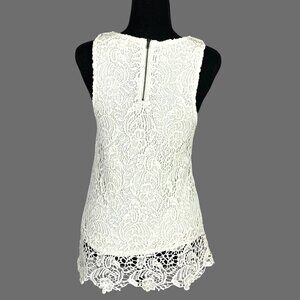 Cream white lace sleeveless top by Lucky Brand. Zippered upper back ¼ length. Body 100% cotton. Trim fabric 100% viscose. Made in the Philippines. Listed as a size XS.