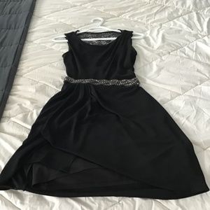 Black cocktail dress with high neckline, lace back and raised side. Very flattering.