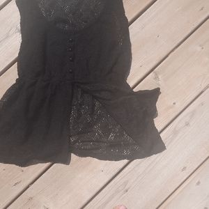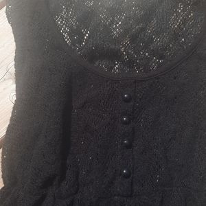 Sheer black babydoll blouse Decorative buttons at chest, then flares to a peplum at waistline
