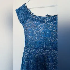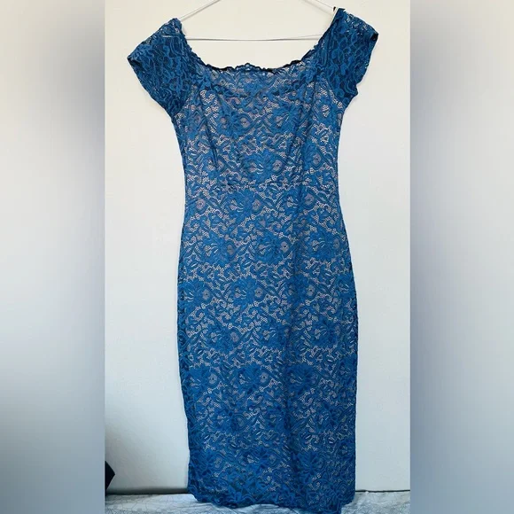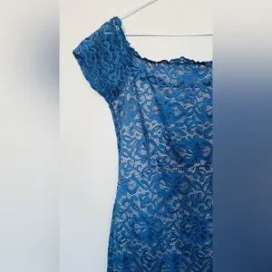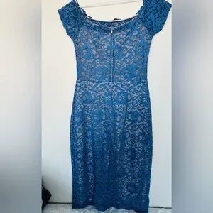 Beautiful lace dress that can also be worn off shoulder. Very stretchable and comfortable. It can also be worn while pregnant. I could fit into it while i was pregnant but fits me well now too. No brand or size tag but the quality is really nice. Fits like a medium.