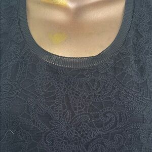 This black tank top features a scoop neckline and lace front. The back is plain stretchy material. There is mesh trim around neckline and armholes. It’s perfect for warm weather or layering. Made from lightweight fabric, it offers a comfortable fit with standard tank top armholes.