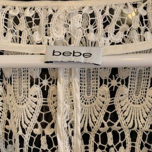 Cascade front lace Bebe jacket. There is no size on the jacket but it fits like a size 4 (reason I wrote size 4). The front of the jacket cascades open. The jacket is gently worn, with no stains.