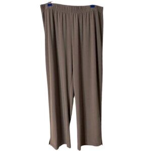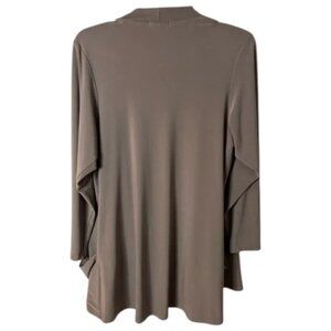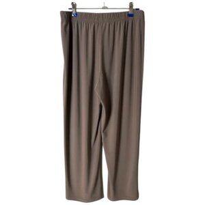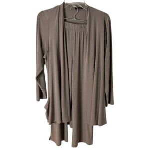 Lace 2-piece taupe lounge set consisting of a long-sleeve top and matching ankle pants. The cardigan is a draped, waterfall-style with open-front panels that hang loosely, and it has long, fitted sleeves. The length of the cardigan falls below the hips. The pants feature a relaxed, straight-leg or wide-leg fit with an elastic waistband for a comfortable, pull-on style. The full-length pants end at or near the ankle, completing the lounge set.