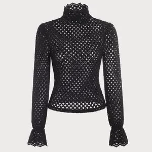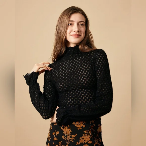 Size S. Never worn. Velvety texture. See-through. Ruffle sleeve and mock neck.