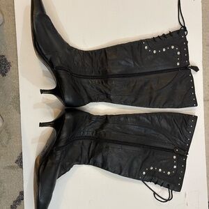Lace up leather boots with rhinestones and kitten heel.