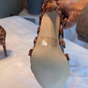 This is a pair of open-toe, lace-up sandals featuring a bold leopard print design. Made of a soft, suede-like materials with a striking cut-out pattern along the sides. The laces criss-cross up the front adding a stylish and adjustable detail. Heels are also in leopard print adding an elegant look. These sandals combine a playful animal print with a modern sophisticated design perfect for making a statement.