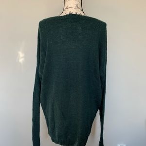 Cozy, emerald green sweater. The material is soft, not scratchy at all! Very warm and can be easily adjusted to appear shorter. As all the clothes I sell, it has no flaws and has been worn twice maximum. If you want to know the specific measurements, feel free to request them! :)