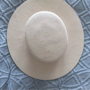Ivory wide-brimmed boater trimmed with gold vintage patterned ribbon from the 1950s.