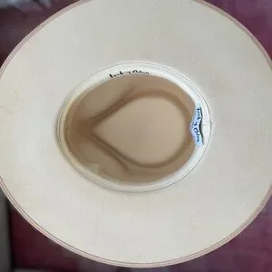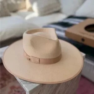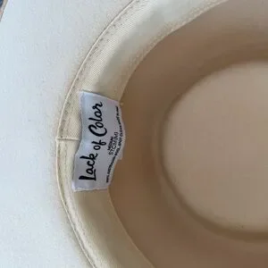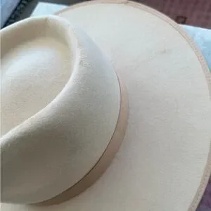 Trimmed with tonal tan gross grain edged hat rim and bow ribbon detail