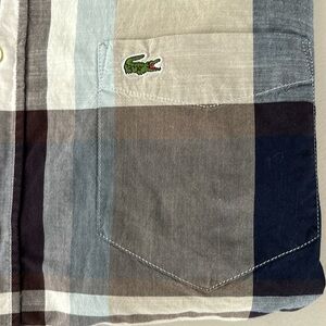 DESCRIPTION: A Regular Fit Men’s Classic & Casual Plaid Button Down. Made in France. Lacoste logo on Chest. pocket. Blues, Grey & Pink.