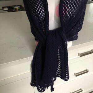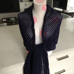 Features: open weave, knit, wrap or scarf, logo, versatile, cozy, casual