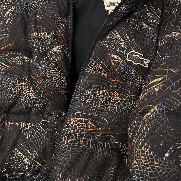Eye-catching Lacoste jacket with vibrant patterns. Features a mix of colors on a dark base.reversible.navy on one side, other side has flecks of colour.