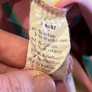 Classic Lacoste short-sleeve polo shirt in a fun pink multicolor stripe pattern. Made of soft and stretchy cotton-elastane blend (97% cotton, 3% elastane). Size 40, which corresponds to a Medium. Iconic crocodile logo embroidered on the chest, button placket, and fitted silhouette.