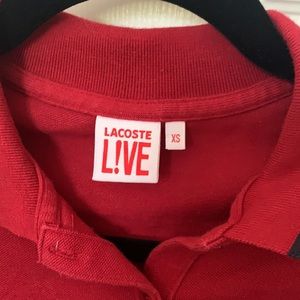 Lacoste L!VE Short Sleeve Tipped Stretch Pique Polo, size XS, VERMILION RED with NAVY BLUE stripes on collar and cuffs, gently worn