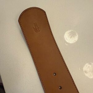Elevate your wardrobe with this authentic Lacoste wide tan leather belt, a unique and fashion-forward accessory perfect for styling over dresses, coats, or high-waisted trousers. Made from genuine leather, this belt features: