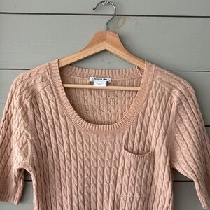 Indulge in quiet luxury with this Lacoste short sleeve sweater in a soft blush pink. Made from a premium blend of 70% wool and 30% cashmere, it features a classic cable knit design, ribbed trim, front chest pocket, and silver croc logo detail on the sleeve. Gently worn with a small flaw near the back neckline (see photos/ barely noticeable), but still cozy, elegant, and ready for layering.