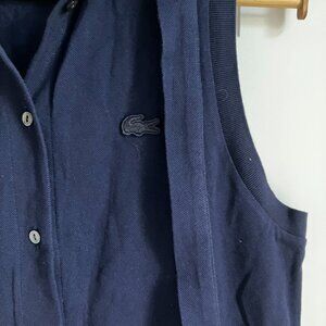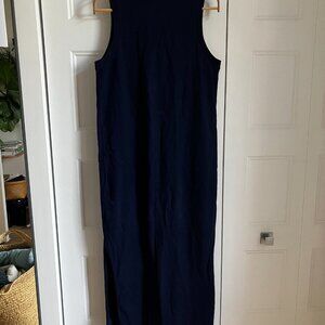 Like new, worn a couple of times. Cotton, with a belt and side slits. Dark navy.