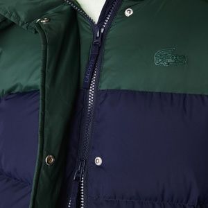 Concealed side pockets and Lacoste double slider zipper beneath snap placket