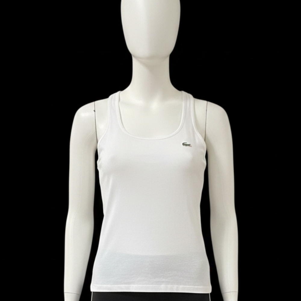 The perfect summer top. From Lacoste women's White Cotton sleeveless top with racerback style. Has the Lacoste alligator logo sewn on the front. Tag reads size 42. It fits like a medium. Caretag was removed. Has been preowned with one side of the strap has to be resewn.