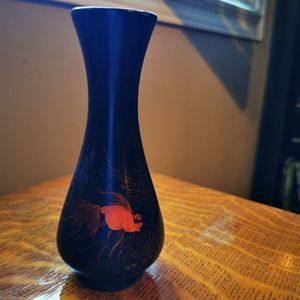 🍒 Lacquer Finish Vase with Goldfish Scene ~ Black Lacquer with Orange Goldfish