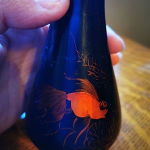 my pictures make this look blueish but it's a high gloss black lacquer with a gracefully painted goldfish scene with 2 goldfish and seaweed and bubbles