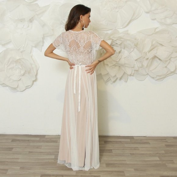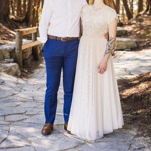 Selling my wedding dress! I bought it used (the last owner had bought it off Etsy (it is now listed on there as $890!!), tried it on, then decided against it and sold it - so it was brand new when I got it). Beautiful and flattering, size 8 but with an elastic waist, so it is very forgiving and comfortable! Perfect for a full day of eating and dancing. Cream underlay with white tulle skirt and lace top. Clear straps hold up the cream underlay on the top and it is sewn into the elastic waist. Slightly longer in the front and back than the sides. The model in the first 3 photos has a ribbon around the middle, mine didn't come with one but you can always add if you want. I am 5'7" and it brushed the ground at the perfect height with a slight heel.