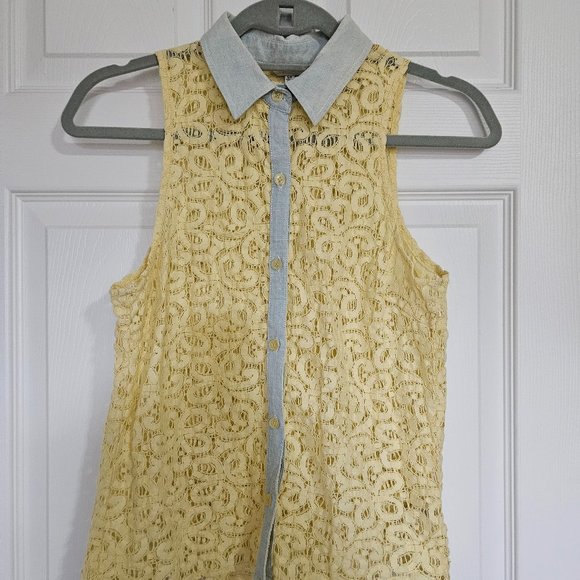 Lacy collared sleeveless blouse. Light buttercup yellow, see-through patterned lace, with a denim/chambray accent for the collar and front placket. Would be super cute under a sweater, or over a bralette.