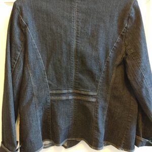 Ladies dark wash denim fitted jacket with much top-stitching detail. Shoulder pads help to round out the shoulders giving the jacket a formal look. They can be removed if desired. The sleeves are detailed with turn-up cuffs with a top-stitched opening. There is a great deal of detail to this jean jacket. The over sized buttons, trimmed-out flaps on each of the pockets, top-stitched darts, and rounded hem. This jacket is in excellent used condition.