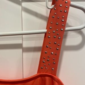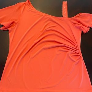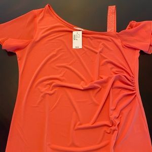 Beautiful coral pink summer blouse, cold shoulder style with small strap with diamantes on strap, sleeves are sheer fabric, ruching on left side. 90% polyester 10% spandex, sleeves 100% polyester.New unused item, label still attached.