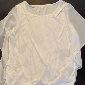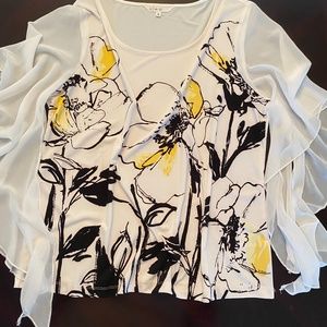Beautiful flowy white blouse with black and yellow giant flowers. Sleeves are long split sheer so really more like a shawl than a sleeve.