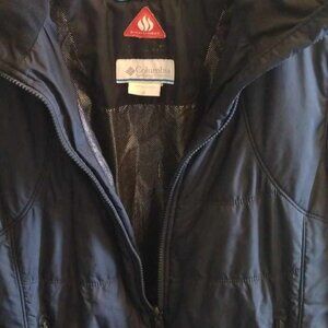 Ladies Black Columbia Interchange Zip up Jacket with Omni Heat, Zippered Front Pockets, couple of shiny marks on the front and left sleeve, marks are not too noticable but are there, otherwise excellent used condition, no rips or tears