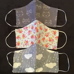 Three ladies (teen) size handmade spring pattern face mask. There is a cat, rain cloud and flower pattern. All are 3 ply with filters and nose piece. Straps are not adjustable. They are matching washable. Recommend hang to dry.