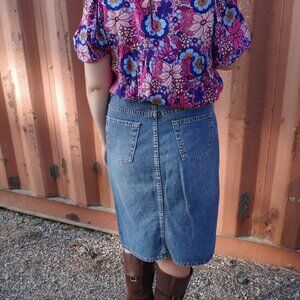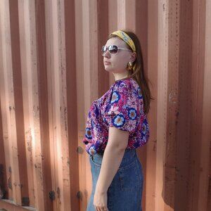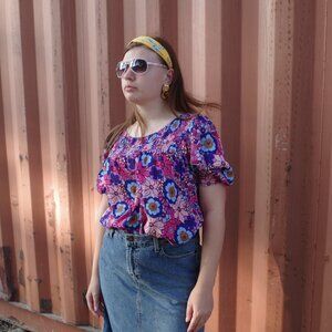 Ladies Floral blouse by Terra & Sky Pit to pit is 23 inches size 14 w ox. made out of 100% Rayon .Button closer back .elastic cuff arms In good shape
