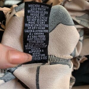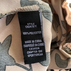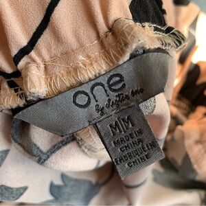 Details - peachy pink like colour with black floral pattern, elastic paper bag style waist.