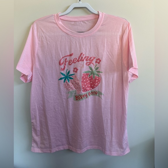 Comfortable t shirt features a fun strawberry print with the phrase 'Feeling Berry Good'.