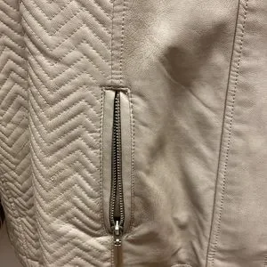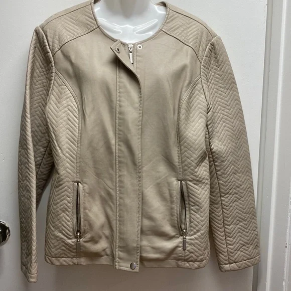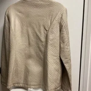 Tan fake leather Jacket. Has some stitching design, throughout jacket and back is complete stitch design.
