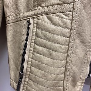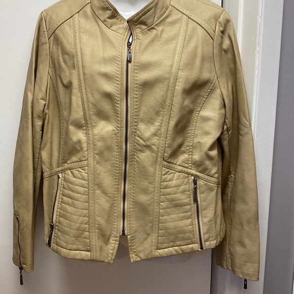 Tan leather like ladies jacket. Zipper pockets as well as zipper sleeve. Has stitching detail.