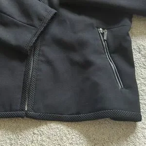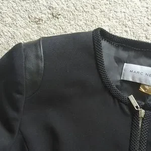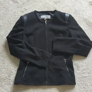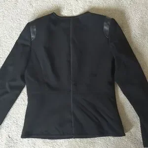 Black Jacket, good condition, leather look feature on shoulders and featured trim around neck, cuffs, down the center of back and front and around the hem.